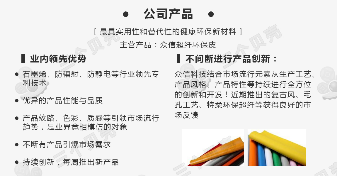 众信超纤科技股份有限公司致力于第四代超纤产品的研发,超纤作为一种已成熟应用的新材料,在国际社会各领域中得到广泛的认可。众信科技坚持品质第一,创新第二,时刻把握市场需求,不断创新持续推出超纤新产品,引领潮流。公司目前以晋江、石狮鞋服产业为核心客户群体,并逐渐渗透到沙发、箱包、汽车内饰等真皮、合成革等应用领域。公司一方面针对市场需求加快新产品研发速度,一方面充分发挥公司的资源整合能力,以自身的专业水平,挑选优质的生产厂家,帮助客户把关产品质量和推荐流行趋势新品,打造一流的超纤资源整合平台,为客户提供全方位的供应链解决方案。