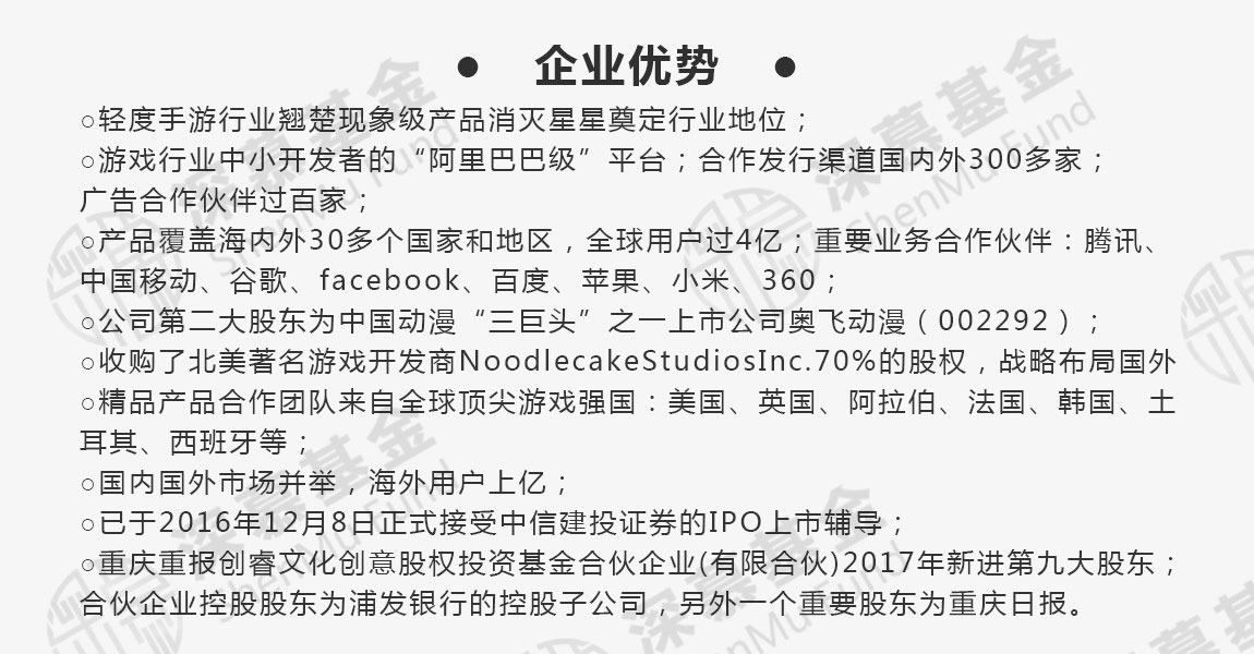 掌游天下信息技术股份有限公司创立于2010年,专注于手机游戏发行、研发领域和自有流量移动广告。目前主营业务收入广告占比70%,游戏占比30%;公司秉承“全球一体化,全领域发展”的理念,致力于为中小开发者提供专业的发行及运营服务,为海内外的广告运营商服务。