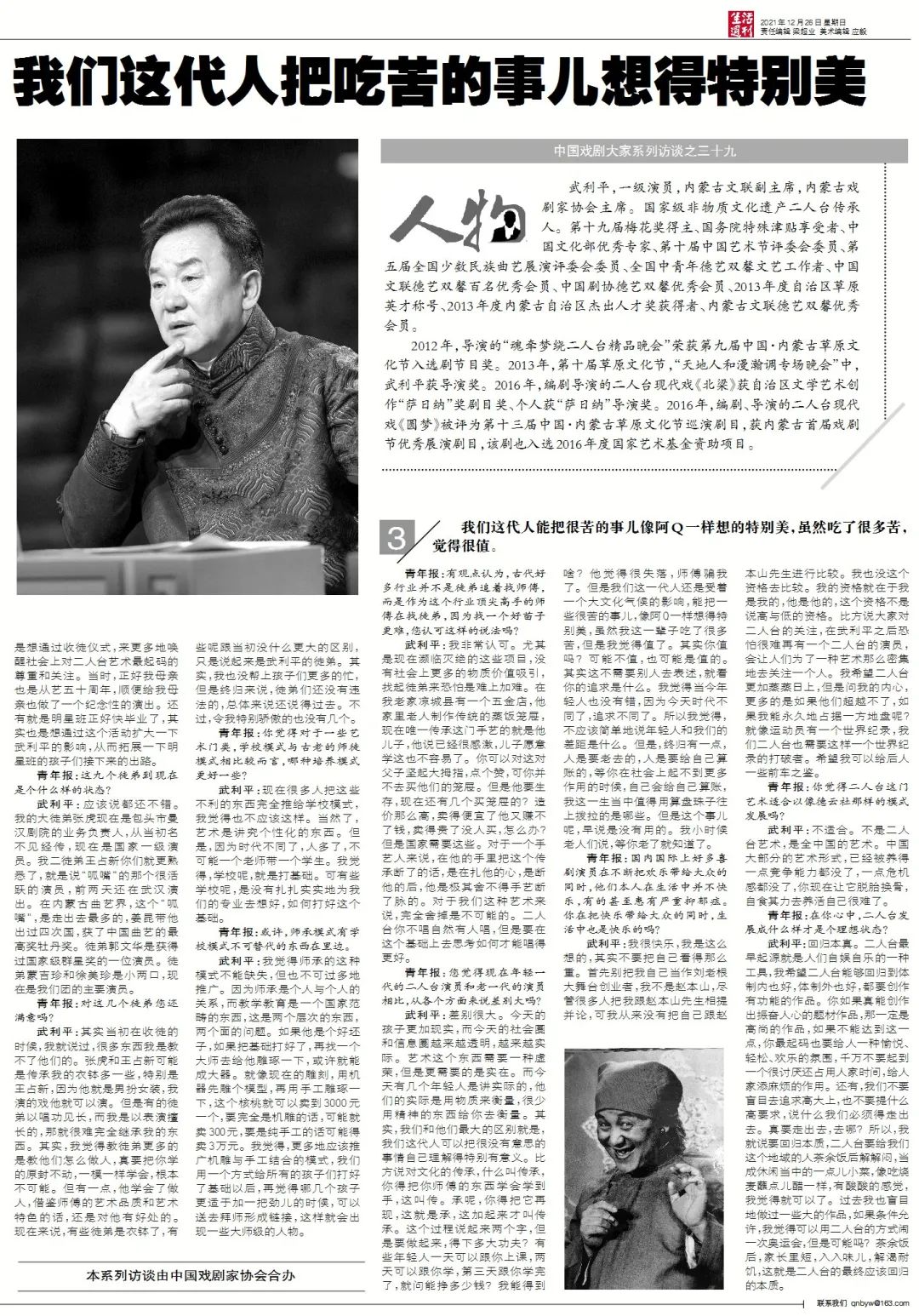 武利平:因为我出生在那个物质生活匮乏的年代,所以对精神上渴求的东西就会更多。另外一点呢,我母亲是山西梆子演员,她完全是受传统文化的教育和影响成长起来的,应该是中国第二代的戏曲演员。我小时候就经常去看母亲演出,看到那么多观众对她追捧,对她那么喜欢,在我的潜意识里,就形成了对戏曲的热爱,进而爱戏、学戏、唱戏,最终又加入到了乌兰牧骑剧团当中。